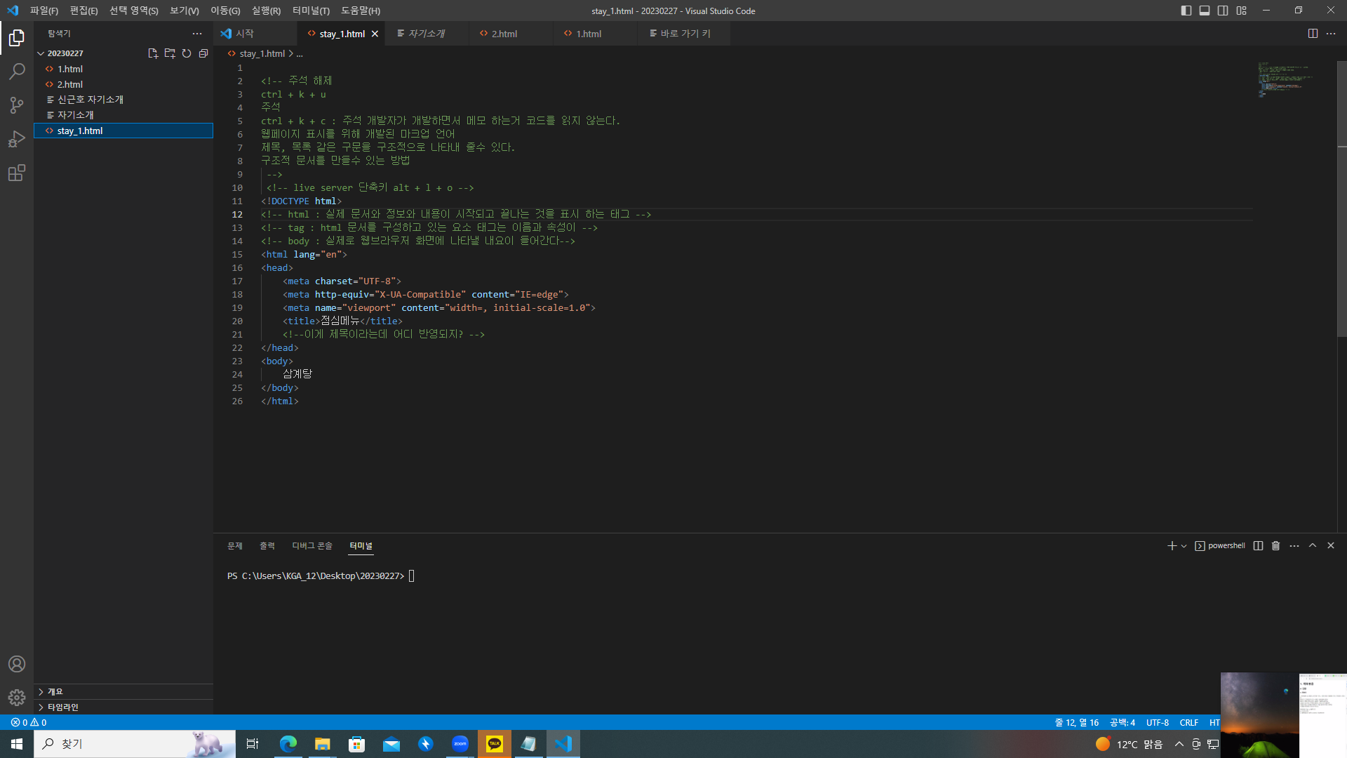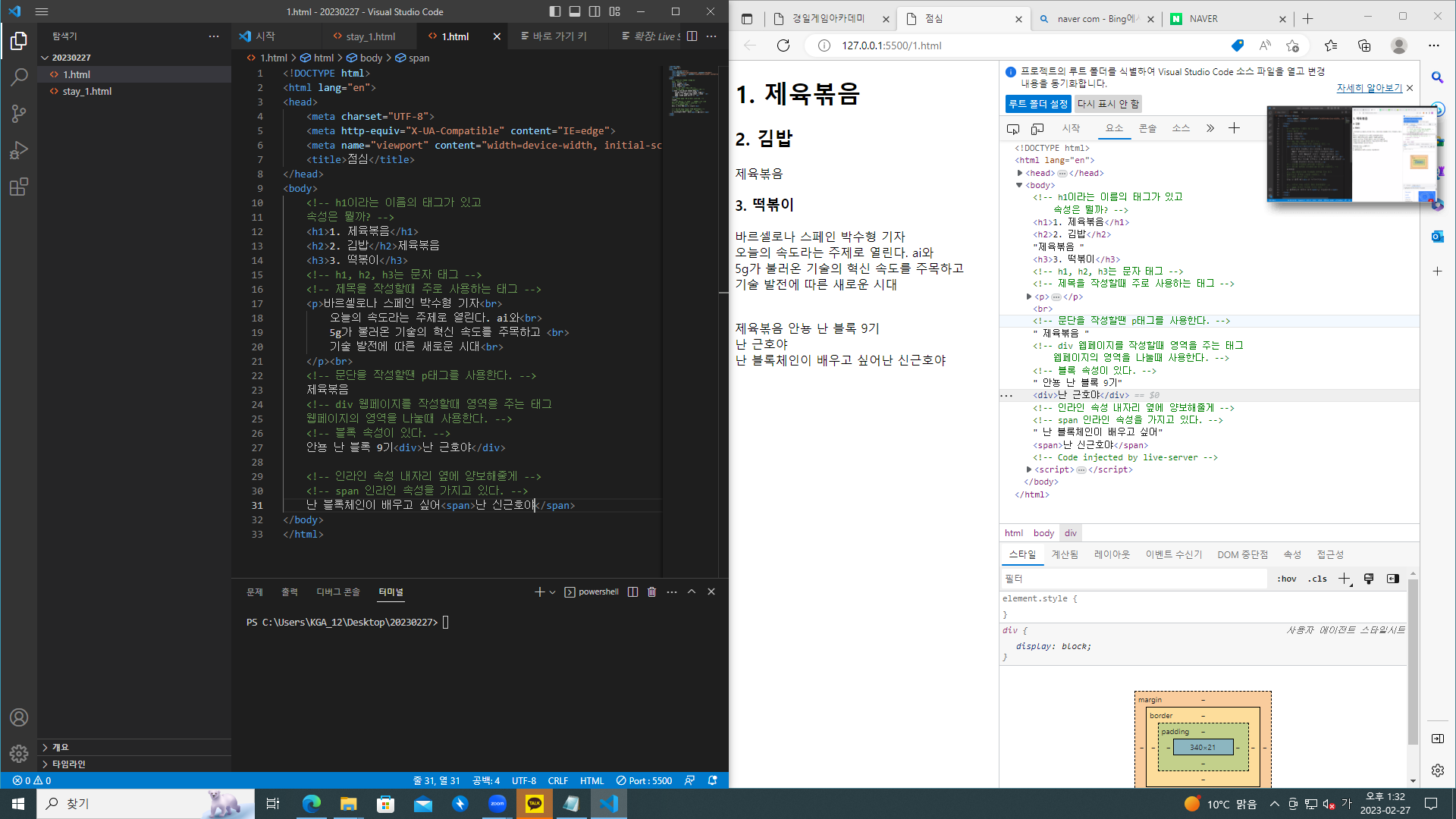 이제 visual studio code를 설치후 live server, korean language를 다운로드후 시작하였는데 아까 열었던 메모 브라우저랑 같이열고 visual studio code에서 코드를 입력하면 메모에도 그대로 입력이 되었다.