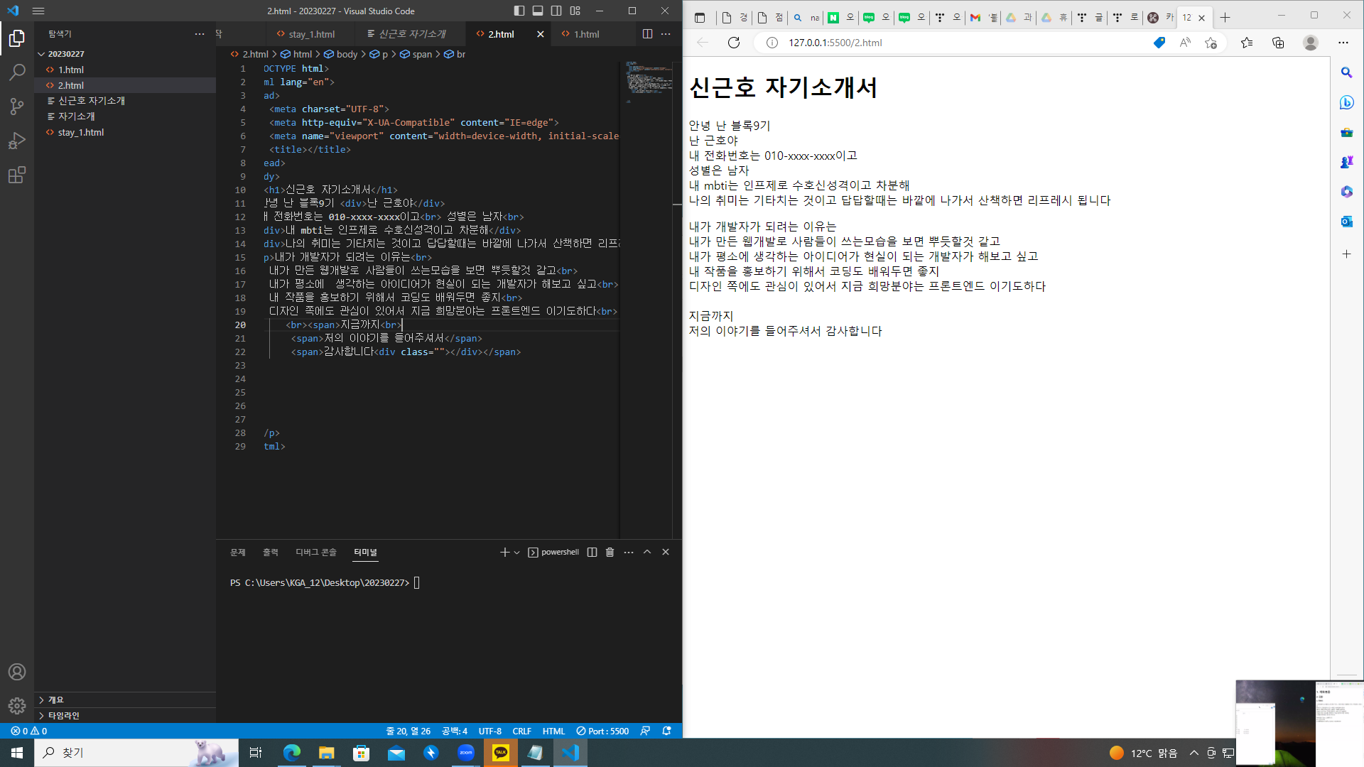 맨위 사진은 오늘 배운 태그들 모두 이용해서 자기소개서를 작성하는 것이다.